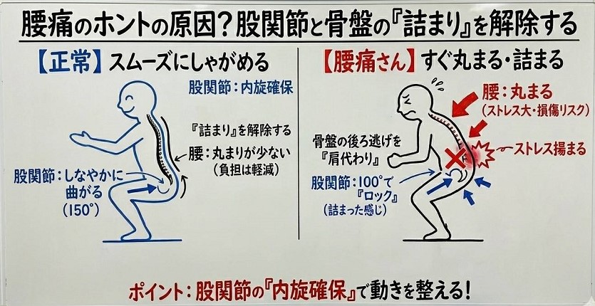 大切なのは、骨盤が後傾し始めるのをギリギリまで待てるだけの、「股関節の余裕(可動域)」を作ってあげることです。